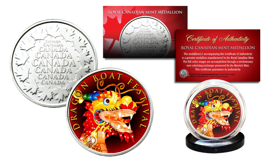 Here is your opportunity to own a DRAGON BOAT FESTIVAL colorized Royal Canadian Mint Medallion, which has been beautifully enhanced with colorized images by the Merrick Mint. Each medallion comes in a premium coin capsule with a full color Certificate of Authenticity. This medallion has been colorized with an application of special inks directly to the surface, using a unique and painstakingly multicolor process, which achieves a level of detail, color saturation, and durability that is #1 in the industry. Each medallion is about the same size as a U.S. Half Dollar coin and features a Canada Maple Leaf design on the reverse and a colorized Dragon Boat Festival image on the obverse.