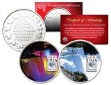 Here is your chance to own a complete set of two (2) colorized Royal Canadian Mint Medallions featuring NIAGARA FALLS. The 2-medallion set includes: a “NIAGARA FALLS – DAYTIME VIEW” medallion plus a “NIAGARA FALLS – NIGHTTIME VIEW” medallion, which has been beautifully enhanced with colorized images by the Merrick Mint. The 2-medallion set comes with a full color Certificate of Authenticity with each medallion coming in a premium coin capsule. These medallions have been colorized with an application of special inks directly to the surface, using a unique and painstakingly multicolor process, which achieves a level of detail, color saturation, and durability that is #1 in the industry. Each medallion is about the same size as a U.S. Half Dollar coin and features a Canada Maple Leafs design on the reverse and a colorized NIAGARA FALLS image on the obverse.