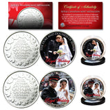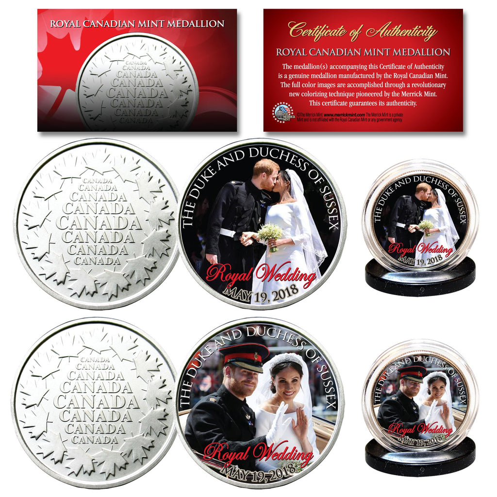 The world watched on May 19, 2018 as the lovely Meghan Markle married her dashing Prince Harry. To commemorate this significant occasion, The Merrick Mint has commissioned this stunning colorized Royal Canadian Mint Medallion 2-Coin Set with the actual images from the Royal Wedding on May 19, 2018. With images that perfectly reflect the pure joy on the day Prince Harry and Meghan exchanged their vows, this Collector's Edition coin set is an unforgettable way to relive a royal celebration that will go down in history! Commemorate the fairy tale royal wedding of The Duke and Duchess of Sussex, with this magnificent Royal Canadian Mint Medallion 2-Coin Set. The 2-medallion set comes with a full color Certificate of Authenticity with each medallion coming in a premium coin capsule. These medallions have been colorized with an application of special inks directly to the surface, using a unique and painstakingly multicolor process, which achieves a level of detail, color saturation, and durability that is #1 in the industry. Each medallion is about the same size as a U.S. Half Dollar coin and features a Canada Maple Leafs design on the reverse and a colorized image on the obverse.