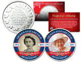 Here is your chance to own the QUEEN ELIZABETH II – LONGEST REIGNING MONARCH IN BRITISH HISTORY complete set of two (2) colorized Royal Canadian Mint Medallions. The 2-medallion set has been beautifully enhanced with colorized images by the Merrick Mint. The 2-medallion set comes with a full color Certificate of Authenticity with each medallion coming in a premium coin capsule. These medallions have been colorized with an application of special inks directly to the surface, using a unique and painstakingly multi-color process, which achieves a level of detail, color saturation, and durability that is #1 in the industry. Each medallion is about the same size as a U.S. Half Dollar coin and features a Canada Maple Leafs design on the reverse and a colorized image on the obverse.