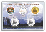 Here is your opportunity to own or gift the 2004 KEELBOAT JOURNEY NICKEL COLLECTION which is part of the Westward Journey Nickel Series. The complete 5-coin set that you will receive will feature 5 different versions of the same coin including 3 enhancements by the Merrick Mint in spectacular Colorization, Hologram, and 24K Gold Plated. To complete your 5-coin set, you will also receive an uncirculated Philadelphia Mint coin and Denver Mint coin. The everlasting enhanced coins are ultra-high quality collectibles. Each coin is genuine legal tender of the United States. Each coin features an obverse image of President Jefferson and reverse image of the keelboat in full sail through the rivers of the Louisiana Territory with Captains Lewis and Clark in full uniform in the bow. The 5-Coin Set comes displayed on a die-cut display with beautiful artwork sealed in acrylic airtight case.
