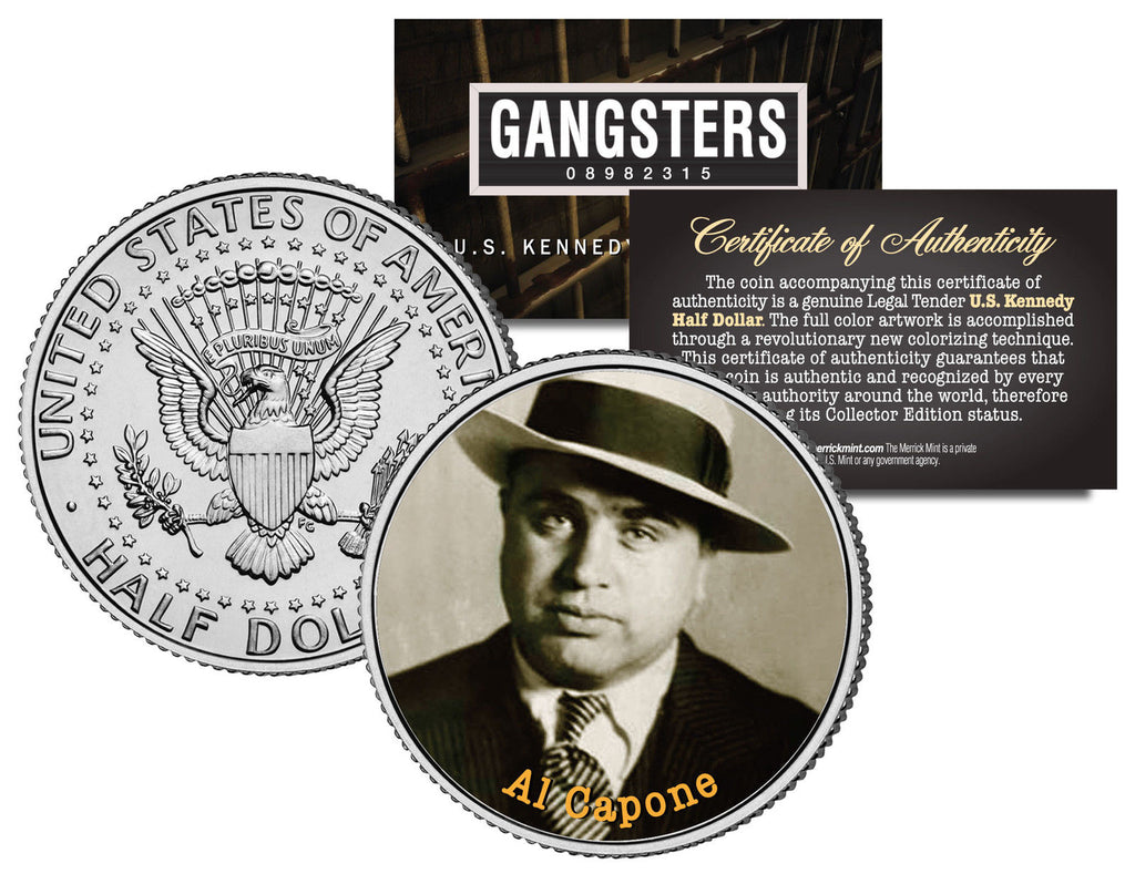 This GANGSTER SERIES - AL CAPONE coin is a treasured collectible. Here is your chance to own a beautifully colorized JFK Kennedy Half Dollar U.S. Coin. This high-quality genuine Legal Tender U.S. coin has been colorized using a unique painstaking multicolor authentic process. Colorizing coins involves the unique application of special inks directly to the surface of a coin that achieves a level of detail, color saturation, and durability that is #1 in the coin industry. The result is an everlasting colorized coin collectible of ultra-high quality. Each coin comes in a premium coin capsule with a Certificate of Authenticity.