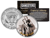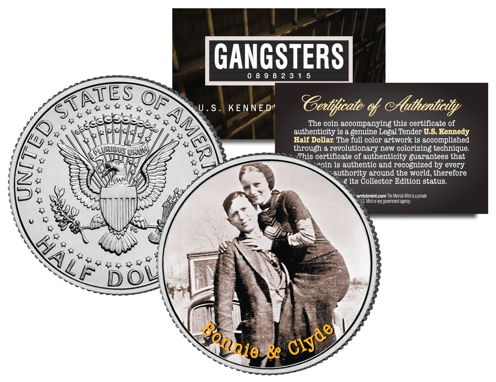 This GANGSTER SERIES - BONNIE AND CLYDE coin is a treasured collectible. Here is your chance to own a beautifully colorized JFK Kennedy Half Dollar U.S. Coin. This high-quality genuine Legal Tender U.S. coin has been colorized using a unique painstaking multicolor authentic process. Colorizing coins involves the unique application of special inks directly to the surface of a coin that achieves a level of detail, color saturation, and durability that is #1 in the coin industry. The result is an everlasting colorized coin collectible of ultra-high quality. Each coin comes in a premium coin capsule with a Certificate of Authenticity.