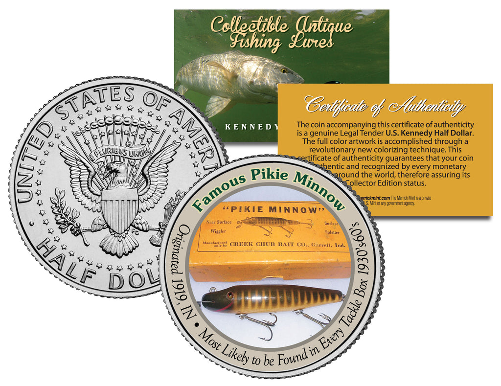 COLLECTIBLE ANTIQUE FISHING LURES SERIES – Famous Pikie Minnow (Most Likely to be Found in Every Tackle Box 1930’s-60’s – Originated 1919, IN). Here is your chance to own an OFFICIAL beautifully colorized JFK Kennedy Half Dollar U.S. Coin. This official high-quality genuine Legal Tender United States coin has been colorized using a unique painstaking multicolor authentic process. Colorizing coins involves the unique application of special inks directly to the surface of a coin that achieves a level of detail, color saturation, and durability that is #1 in the industry. The result is an everlasting colorized coin collectible of ultra-high quality. Each coin comes in a premium coin capsule with a Certificate of Authenticity.