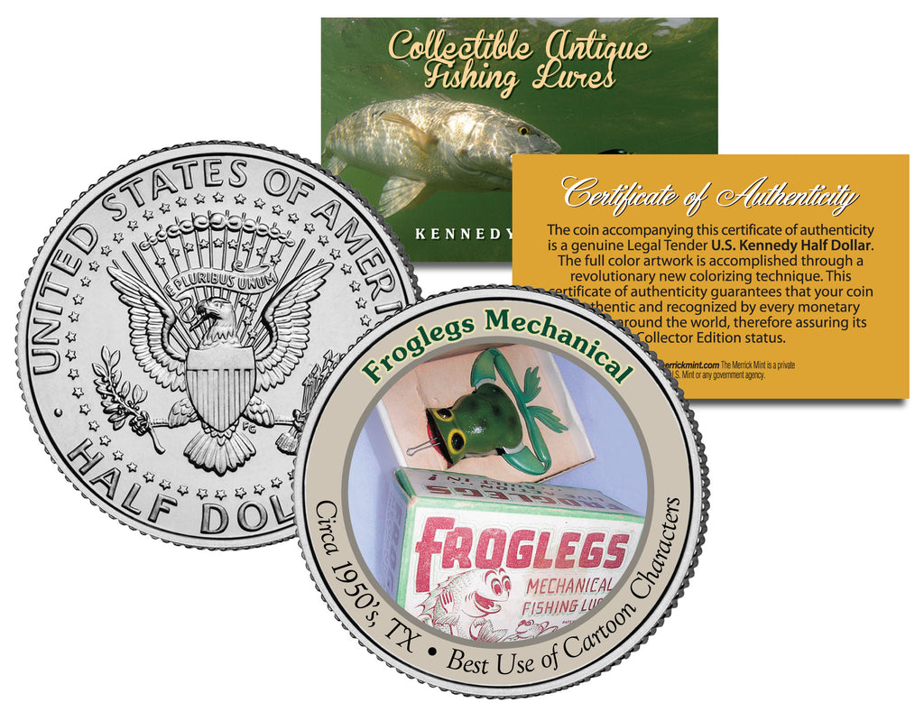 COLLECTIBLE ANTIQUE FISHING LURES SERIES – Froglegs Mechanical (Best Use of Cartoon Characters – Circa 1950’s, TX). Here is your chance to own an OFFICIAL beautifully colorized JFK Kennedy Half Dollar U.S. Coin. This official high-quality genuine Legal Tender United States coin has been colorized using a unique painstaking multicolor authentic process. Colorizing coins involves the unique application of special inks directly to the surface of a coin that achieves a level of detail, color saturation, and durability that is #1 in the industry. The result is an everlasting colorized coin collectible of ultra-high quality. Each coin comes in a premium coin capsule with a Certificate of Authenticity.