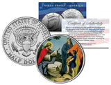 Here is your opportunity to own the JESUS CHRIST – BLESSING collectible coin. This colorized JFK Kennedy Half Dollar U.S. Coin has been enhanced with a beautiful colorized image by the Merrick Mint. Each coin comes in a premium coin capsule with a full color Certificate of Authenticity to guarantee that your coin is authentic and recognized by every monetary authority around the world, assuring its Collector Edition status. This Legal Tender United States coin has been colorized with an application of special inks directly to the surface of the coin, using a unique and painstakingly multicolor coin process, which achieves a level of detail, color saturation, and durability that is #1 in the coin industry. The result is an everlasting colorized coin collectible of ultra-high quality. The Kennedy half dollar is a U.S. fifty cent coin with coin year and mint marks chosen at random.