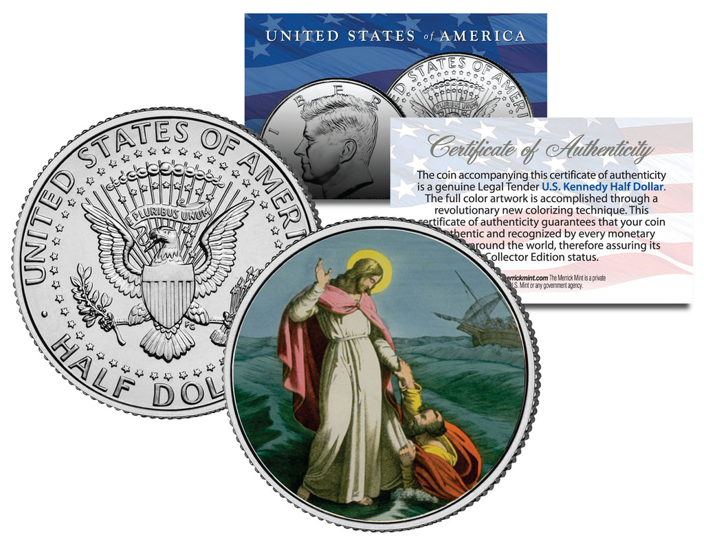 Here is your opportunity to own the JESUS CHRIST – WALKING ON WATER collectible coin. This colorized JFK Kennedy Half Dollar U.S. Coin has been enhanced with a beautiful colorized image by the Merrick Mint. Each coin comes in a premium coin capsule with a full color Certificate of Authenticity to guarantee that your coin is authentic and recognized by every monetary authority around the world, assuring its Collector Edition status. This Legal Tender United States coin has been colorized with an application of special inks directly to the surface of the coin, using a unique and painstakingly multicolor coin process, which achieves a level of detail, color saturation, and durability that is #1 in the coin industry. The result is an everlasting colorized coin collectible of ultra-high quality. The Kennedy half dollar is a U.S. fifty cent coin with coin year and mint marks chosen at random.