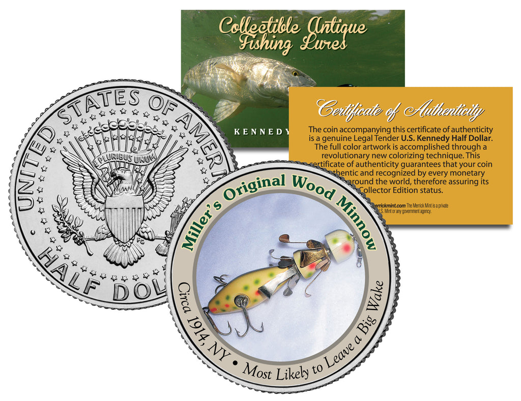 COLLECTIBLE ANTIQUE FISHING LURES SERIES – Miller’s Original Wood Minnow (Most Likely to Leave a Big Wake – Circa 1914, NY). Here is your chance to own an OFFICIAL beautifully colorized JFK Kennedy Half Dollar U.S. Coin. This official high-quality genuine Legal Tender United States coin has been colorized using a unique painstaking multicolor authentic process. Colorizing coins involves the unique application of special inks directly to the surface of a coin that achieves a level of detail, color saturation, and durability that is #1 in the industry. The result is an everlasting colorized coin collectible of ultra-high quality. Each coin comes in a premium coin capsule with a Certificate of Authenticity.