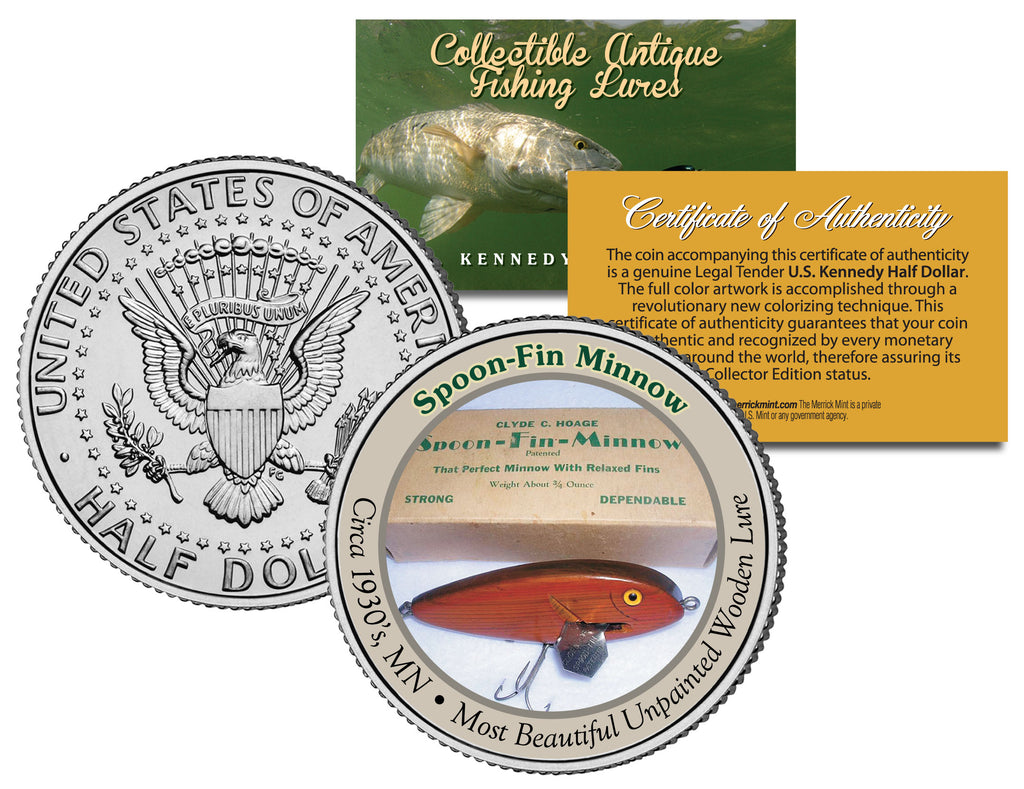 COLLECTIBLE ANTIQUE FISHING LURES SERIES – Spoon-Fin Minnow (Most Beautiful Unpainted Wooden Lure - Circa 1930’s, MN). Here is your chance to own an OFFICIAL beautifully colorized JFK Kennedy Half Dollar U.S. Coin. This official high-quality genuine Legal Tender United States coin has been colorized using a unique painstaking multicolor authentic process. Colorizing coins involves the unique application of special inks directly to the surface of a coin that achieves a level of detail, color saturation, and durability that is #1 in the industry. The result is an everlasting colorized coin collectible of ultra-high quality. Each coin comes in a premium coin capsule with a Certificate of Authenticity.