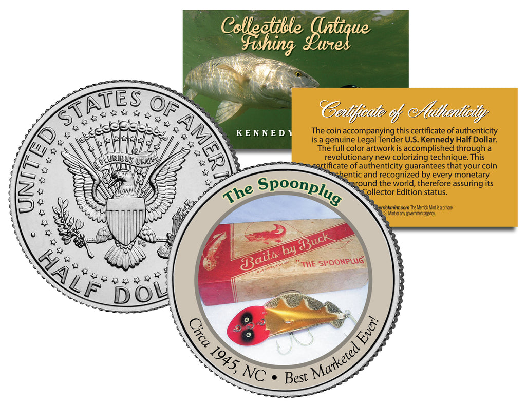 COLLECTIBLE ANTIQUE FISHING LURES SERIES – The Spoonplug (Best Marketed Ever! - Circa 1945, NC). Here is your chance to own an OFFICIAL beautifully colorized JFK Kennedy Half Dollar U.S. Coin. This official high-quality genuine Legal Tender United States coin has been colorized using a unique painstaking multicolor authentic process. Colorizing coins involves the unique application of special inks directly to the surface of a coin that achieves a level of detail, color saturation, and durability that is #1 in the industry. The result is an everlasting colorized coin collectible of ultra-high quality. Each coin comes in a premium coin capsule with a Certificate of Authenticity.