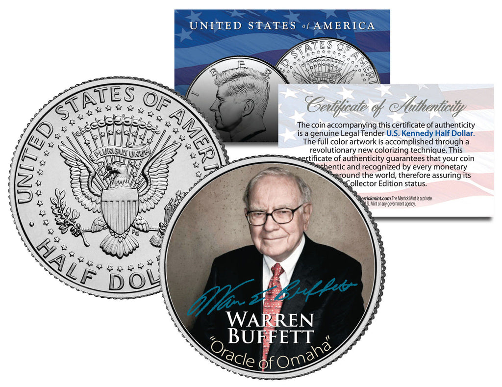 Warren Buffet is an American business magnate, investor, and philanthropist. He is widely considered the most successful investor of the 20th century. Buffet is the chairman, CEO and largest shareholder of Berkshire Hathaway and consistently ranked among the world's wealthiest people. He is often called "Wizard of Omaha", "Oracle of Omaha" or the "Sage of Omaha" and is noted for his adherence to the value investing philosophy and for his personal frugality despite his immense wealth. Here is your chance to own or give as a gift his image on a JFK Kennedy Half Dollar Coin that was colorized using an Authentic Colorization Process by the Merrick Mint. The #1 leaders in coin colorization. Brilliant Uncirculated Condition. Genuine legal tender U.S. Kennedy Half Dollar Comes in air-tight acrylic coin holder. VERY LIMITED EDITION....ORDER NOW!!! CERTIFICATE OF AUTHENTICITY INCLUDED