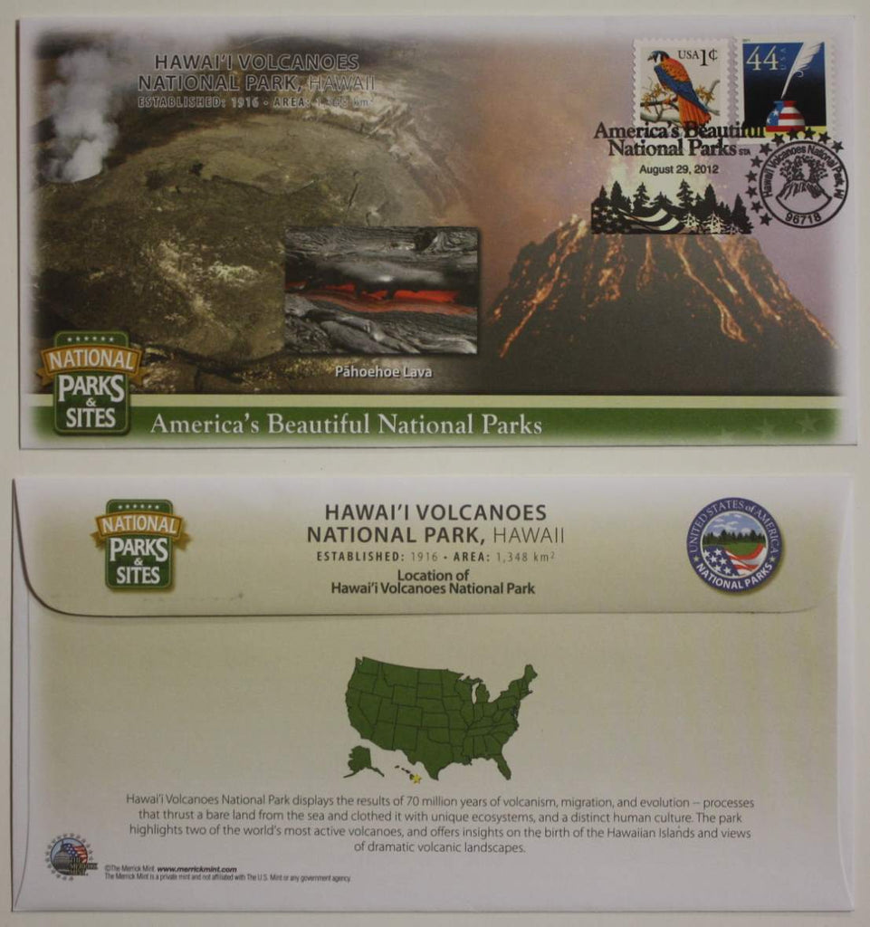 Here is your chance to own a lot of three (3) America’s Beautiful National Parks – HAWAI’I VOLCANOES NATIONAL PARK First Day Covers bearing stamps canceled with an official USPS First Day of Issue pictorial postmark dated August 29, 2012. This cachet special event cover commemorates the release of the Hawaii Volcanoes National Park Quarter. Each high quality double-sided printed envelope measures 7.5" x 3.87". These limited edition envelopes were issued by the Merrick Mint in 2012.
