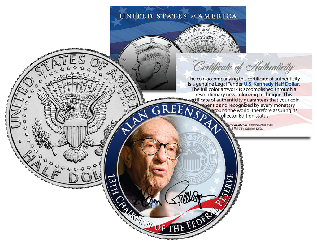 Alan Greenspan was the 13th Chairman of the Federal Reserve which made him the head of the central banking system of the United States. Here is your opportunity to own or to gift, a beautifully colorized JFK Kennedy Half Dollar U.S. Coin. This Legal Tender United States coin has been colorized with an application of special inks directly to the surface of the coin, using a unique and painstakingly multicolor coin process, which achieves a level of detail, color saturation, and durability that is #1 in the coin industry. The result is an everlasting colorized coin collectible of ultra-high quality. Each coin comes in a premium coin capsule with a full color Certificate of Authenticity. The Kennedy half dollar is a U.S. fifty cent coin with coin year and mint marks chosen at random.