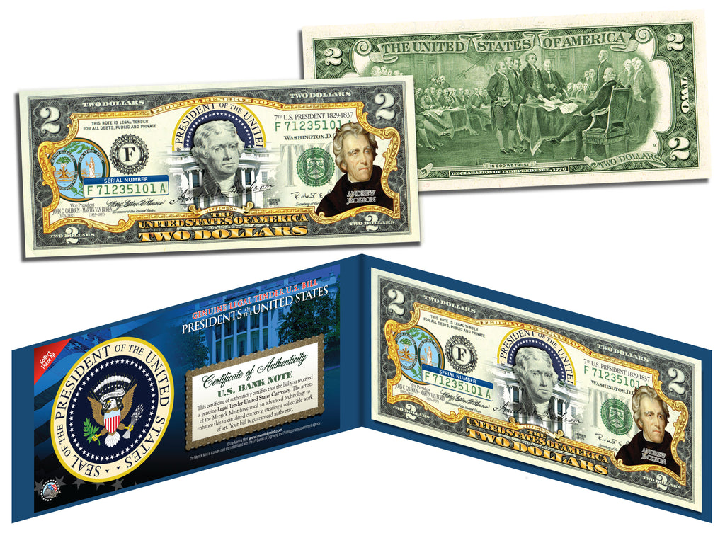 The PRESIDENT ANDREW JACKSON uncirculated $2 Bill is Genuine Authentic Legal Tender of the United States, which has been enhanced with a beautiful colorized image of the President and the Seal of the State of his birthplace on the obverse of the bill. The full colorized images are accomplished through a revolutionary new authentic & genuine colorization process pioneered by The Merrick Mint. Included is a Certificate of Authenticity to guarantee that your bills are authentic and recognized by every monetary authority around the world, and assuring its Collector Edition status. Each $2 Bill is in FRESH, CRISP, UNCIRCULATED condition, and was directly removed from untouched wrapped Federal Reserve sealed packs. Former U.S. President Thomas Jefferson is featured on the obverse of the note, along with the special colorization overlay. The Signing of the Declaration of Independence by John Trumbull is featured on the reverse. It is the only U.S. Currency note that features two Presidents, John Adams and Thomas Jefferson, and it is one of the most rarely seen BILLS in circulation and actual use.