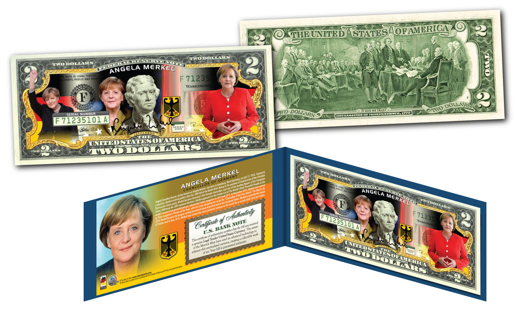 The ANGELA MERKEL uncirculated $2 Bill is Genuine Authentic Legal Tender of the United States. The full colorized images are accomplished through a revolutionary new authentic & genuine colorization process pioneered by The Merrick Mint. The bill comes displayed in a blue folio with a Certificate of Authenticity to guarantee that your bill is authentic and recognized by every monetary authority around the world, and assuring its Collector Edition status. Each $2 Bill is in FRESH, CRISP, UNCIRCULATED condition, and was directly removed from untouched wrapped Federal Reserve sealed packs. Former U.S. President Thomas Jefferson is featured on the obverse of the note, along with the special colorization overlay. The Signing of the Declaration of Independence by John Trumbull is featured on the reverse. It is the only U.S. Currency note that features two Presidents, John Adams and Thomas Jefferson, and it is one of the most rarely seen BILLS in circulation and actual use.