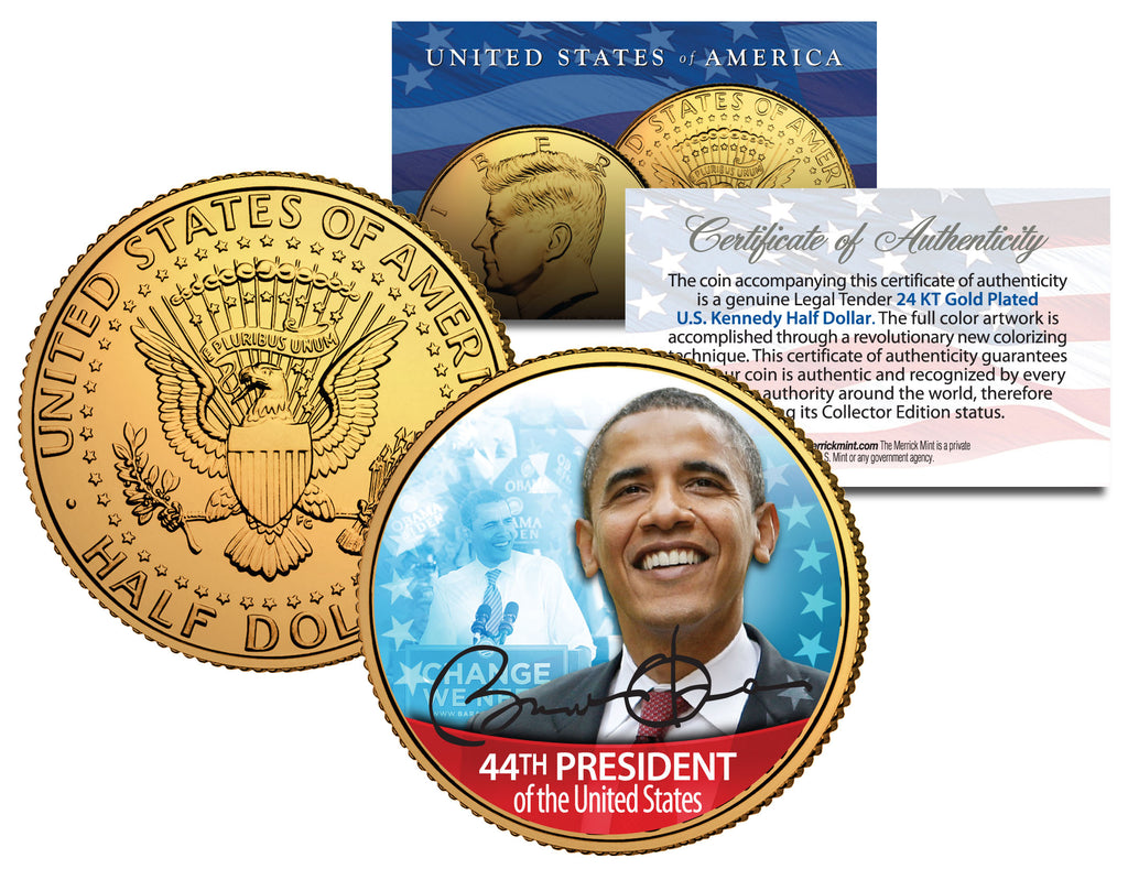 Barack Obama is the 44th President of the United States. Here is your opportunity to own or to gift the “BARACK OBAMA - 44TH PRESIDENT of the United States” colorized JFK Kennedy Half Dollar U.S. Coin, which has been layered in Genuine 24 Karat Gold, and then beautifully enhanced with colorized images by the Merrick Mint. Each coin comes in a premium coin capsule with a full color Certificate of Authenticity. This Legal Tender United States coin has been colorized with an application of special inks directly to the surface of the coin, using a unique and painstakingly multicolor coin process, which achieves a level of detail, color saturation, and durability that is #1 in the coin industry. The result is an everlasting colorized coin collectible of ultra-high quality. The Kennedy half dollar is a U.S. fifty cent coin with coin year and mint marks chosen at random.