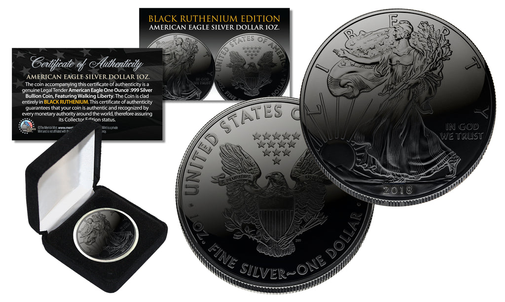 Here is your chance to own the first ever complete BLACK RUTHENIUM EDITION 2018 American Silver Eagle Dollar U.S. Coin. The American Silver Eagle Dollar coin is genuine legal tender struck by the U.S. Mint. It is minted in one full ounce of .999 PURE SILVER and measures a massive 40.6mm in diameter. To highlight the original coin design, the Merrick Mint has clad the coin entirely in Black Ruthenium. Black Ruthenium is a type of platinum metal that looks like a dark platinum, but is 100 times Rarer. Ruthenium is a chemical element with the symbol RU & Atomic # 44. It is a rare transition metal belonging to the platinum group of the periodic table. Each coin comes in a premium coin capsule with a Certificate of Authenticity to guarantee that your coin is authentic and recognized by every monetary authority around the world, assuring its Collector Edition status.