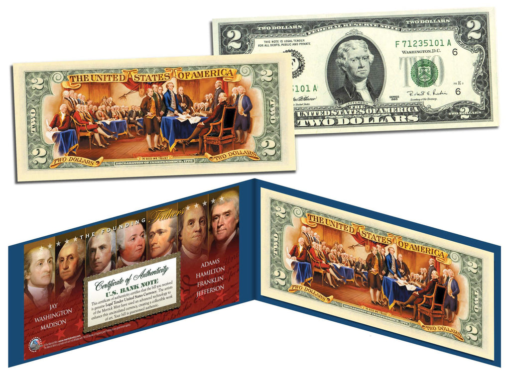 Historian Richard B. Morris in 1973 identified the following seven figures as the key Founding Fathers: John Adams, Benjamin Franklin, Alexander Hamilton, John Jay, Thomas Jefferson, James Madison, and George Washington. THE FOUNDING FATHERS uncirculated $2 Bill is Genuine Authentic Legal Tender of the United States, which has been enhanced with beautiful colorized images on the reverse of the bill. The full colorized images are accomplished through a revolutionary new authentic & genuine colorization process pioneered by The Merrick Mint. Included is a Certificate of Authenticity to guarantee that your bills are authentic and recognized by every monetary authority around the world, and assuring its Collector Edition status. Each $2 Bill is in FRESH, CRISP, UNCIRCULATED condition, and was directly removed from untouched wrapped Federal Reserve sealed packs. Former U.S. President Thomas Jefferson is featured on the obverse of the note. The Signing of the Declaration of Independence by John Trumbull is featured on the reverse, along with the special colorization overlay. It is the only U.S. Currency note that features two Presidents, John Adams and Thomas Jefferson, and it is one of the most rarely seen BILLS in circulation and actual use.