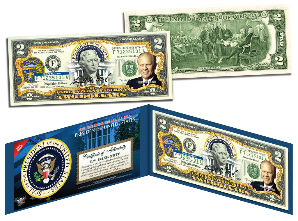 The PRESIDENT GERALD FORD uncirculated $2 Bill is Genuine Authentic Legal Tender of the United States, which has been enhanced with a beautiful colorized image of the President and the Seal of the State of his birthplace on the obverse of the bill. The full colorized images are accomplished through a revolutionary new authentic & genuine colorization process pioneered by The Merrick Mint. Included is a Certificate of Authenticity to guarantee that your bills are authentic and recognized by every monetary authority around the world, and assuring its Collector Edition status. Each $2 Bill is in FRESH, CRISP, UNCIRCULATED condition, and was directly removed from untouched wrapped Federal Reserve sealed packs. Former U.S. President Thomas Jefferson is featured on the obverse of the note, along with the special colorization overlay. The Signing of the Declaration of Independence by John Trumbull is featured on the reverse. It is the only U.S. Currency note that features two Presidents, John Adams and Thomas Jefferson, and it is one of the most rarely seen BILLS in circulation and actual use.