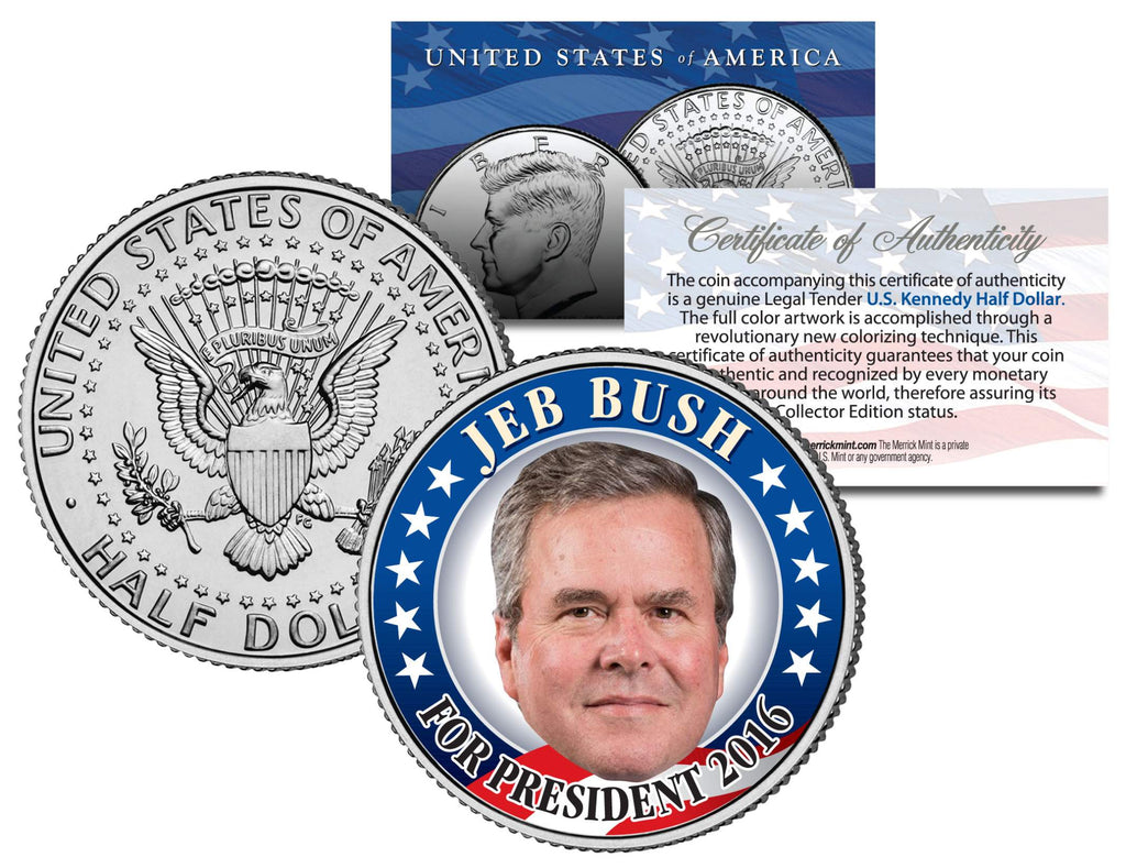This is the JEB BUSH FOR PRESIDENT 2016 collectible coin. Here is your chance to own a beautifully colorized JFK Kennedy Half Dollar U.S. Coin. This high-quality genuine Legal Tender U.S. coin has been colorized using a unique painstaking multicolor authentic process by the Merrick Mint. Colorizing coins involves the unique application of special inks directly to the surface of a coin that achieves a level of detail, color saturation, and durability that is #1 in the coin industry. The result is an everlasting colorized coin collectible of ultra-high quality. Each coin comes in a premium coin capsule with a Certificate of Authenticity to guarantee that your coin is authentic and recognized by every monetary authority around the world, assuring its Collector Edition status.