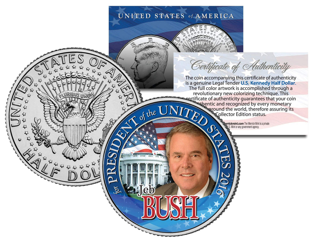 This is the JEB BUSH FOR PRESIDENT OF THE UNITED STATES 2016 collectible coin. Here is your chance to own a beautifully colorized JFK Kennedy Half Dollar U.S. Coin. This high-quality genuine Legal Tender U.S. coin has been colorized using a unique painstaking multicolor authentic process by the Merrick Mint. Colorizing coins involves the unique application of special inks directly to the surface of a coin that achieves a level of detail, color saturation, and durability that is #1 in the coin industry. The result is an everlasting colorized coin collectible of ultra-high quality. Each coin comes in a premium coin capsule with a Certificate of Authenticity to guarantee that your coin is authentic and recognized by every monetary authority around the world, assuring its Collector Edition status.