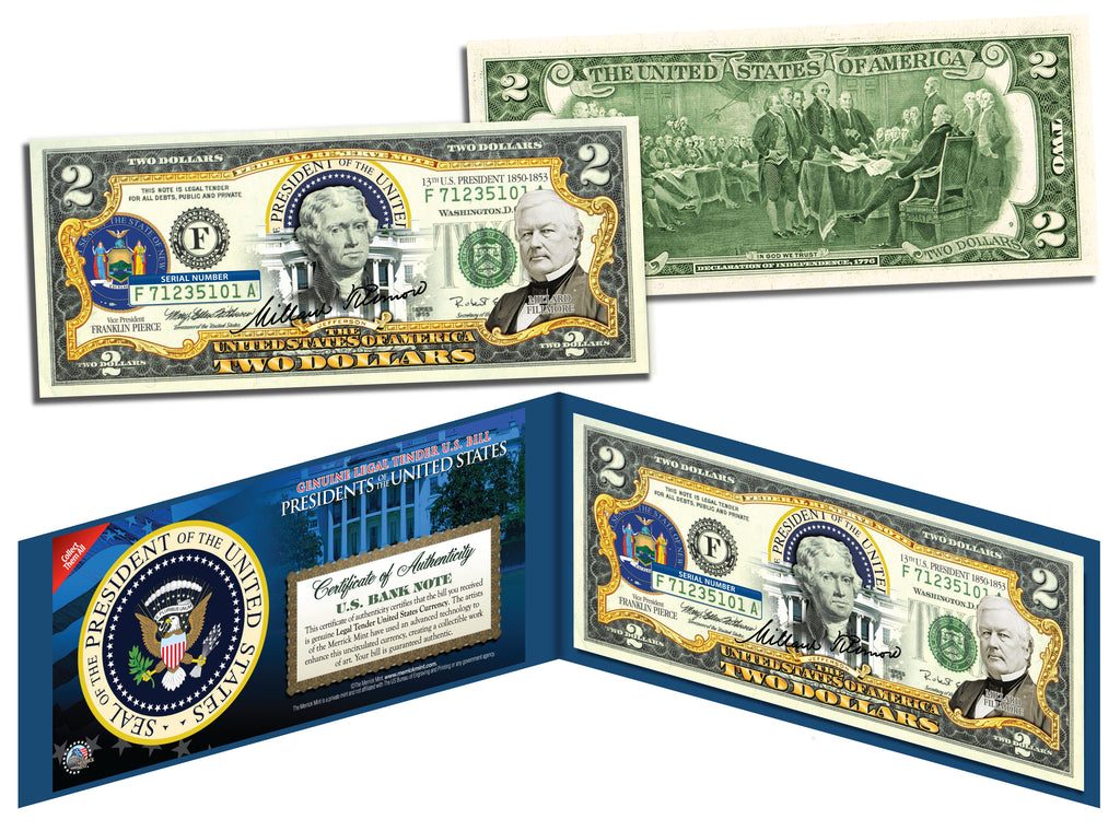 The PRESIDENT MILLARD FILLMORE uncirculated $2 Bill is Genuine Authentic Legal Tender of the United States, which has been enhanced with a beautiful colorized image of the President and the Seal of the State of his birthplace on the obverse of the bill. The full colorized images are accomplished through a revolutionary new authentic & genuine colorization process pioneered by The Merrick Mint. Included is a Certificate of Authenticity to guarantee that your bills are authentic and recognized by every monetary authority around the world, and assuring its Collector Edition status. Each $2 Bill is in FRESH, CRISP, UNCIRCULATED condition, and was directly removed from untouched wrapped Federal Reserve sealed packs. Former U.S. President Thomas Jefferson is featured on the obverse of the note, along with the special colorization overlay. The Signing of the Declaration of Independence by John Trumbull is featured on the reverse. It is the only U.S. Currency note that features two Presidents, John Adams and Thomas Jefferson, and it is one of the most rarely seen BILLS in circulation and actual use.