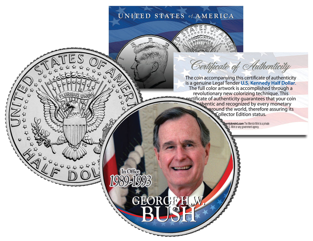 George Herbert Walker Bush was the 41st President of the United States, serving from 1989 to 1993. Here is your opportunity to own or to gift the “GEORGE H. W. BUSH – IN OFFICE 1989-1993” colorized JFK Kennedy Half Dollar U.S. Coin, which has been enhanced with a beautifully colorized image by the Merrick Mint. Each coin comes in a premium coin capsule with a full color Certificate of Authenticity to guarantee that your coin is authentic and recognized by every monetary authority around the world, assuring its Collector Edition status. This Legal Tender United States coin has been colorized with an application of special inks directly to the surface of the coin, using a unique and painstakingly multicolor coin process, which achieves a level of detail, color saturation, and durability that is #1 in the coin industry. The result is an everlasting colorized coin collectible of ultra-high quality. The Kennedy half dollar is a U.S. fifty cent coin with coin year and mint marks chosen at random.