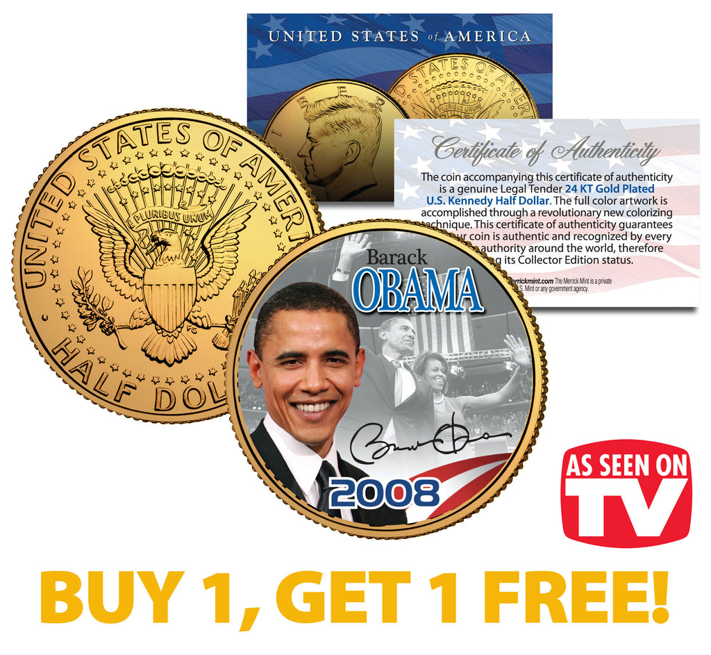 Buy one and get one FREE! As seen on TV, here is your opportunity to own or gift the BARACK OBAMA colorized 2008 JFK Kennedy Half Dollar U.S. Coin, which has been layered in Genuine 24 Karat Gold, and then beautifully enhanced with colorized images by the Merrick Mint. Each coin comes in a premium coin capsule with a full color Certificate of Authenticity to guarantee that your coin is authentic and recognized by every monetary authority around the world, assuring its Collector Edition status. This Legal Tender United States coin has been colorized with an application of special inks directly to the surface of the coin, using a unique and painstakingly multicolor coin process, which achieves a level of detail, color saturation, and durability that is #1 in the coin industry. The result is an everlasting colorized coin collectible of ultra-high quality. The 2008 Kennedy half dollar is a U.S. fifty cent coin with mint marks chosen at random.