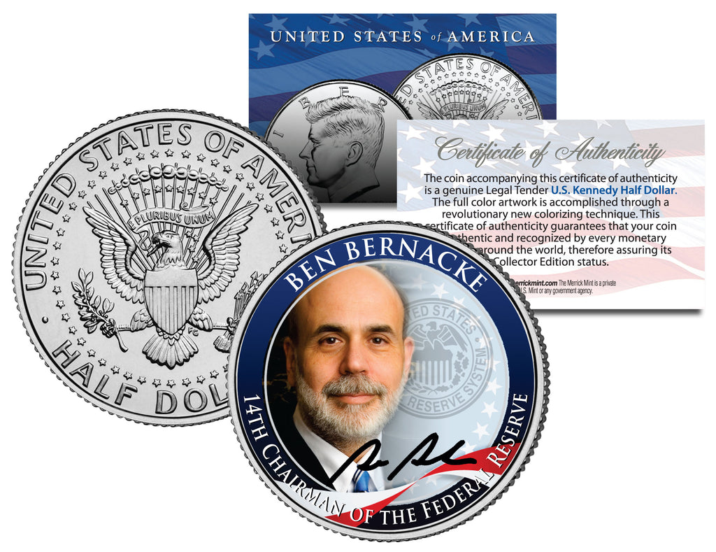 Ben Bernanke is the 14th Chairman of the Federal Reserve which makes him the head of the central banking system of the United States. Here is your opportunity to own or to gift, a beautifully colorized JFK Kennedy Half Dollar U.S. Coin. This Legal Tender United States coin has been colorized with an application of special inks directly to the surface of the coin, using a unique and painstakingly multicolor coin process, which achieves a level of detail, color saturation, and durability that is #1 in the coin industry. The result is an everlasting colorized coin collectible of ultra-high quality. Each coin comes in a premium coin capsule with a full color Certificate of Authenticity. The Kennedy half dollar is a U.S. fifty cent coin with coin year and mint marks chosen at random.
