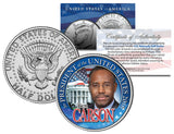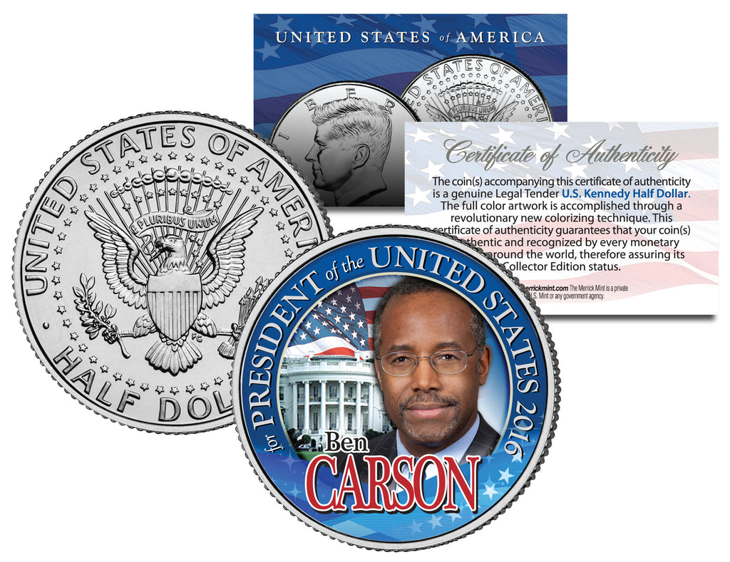 This is the BEN CARSON FOR PRESIDENT OF THE UNITED STATES 2016 collectible coin. Here is your chance to own a beautifully colorized JFK Kennedy Half Dollar U.S. Coin. This high-quality genuine Legal Tender U.S. coin has been colorized using a unique painstaking multicolor authentic process by the Merrick Mint. Colorizing coins involves the unique application of special inks directly to the surface of a coin that achieves a level of detail, color saturation, and durability that is #1 in the coin industry. The result is an everlasting colorized coin collectible of ultra-high quality. Each coin comes in a premium coin capsule with a Certificate of Authenticity to guarantee that your coin is authentic and recognized by every monetary authority around the world, assuring its Collector Edition status.