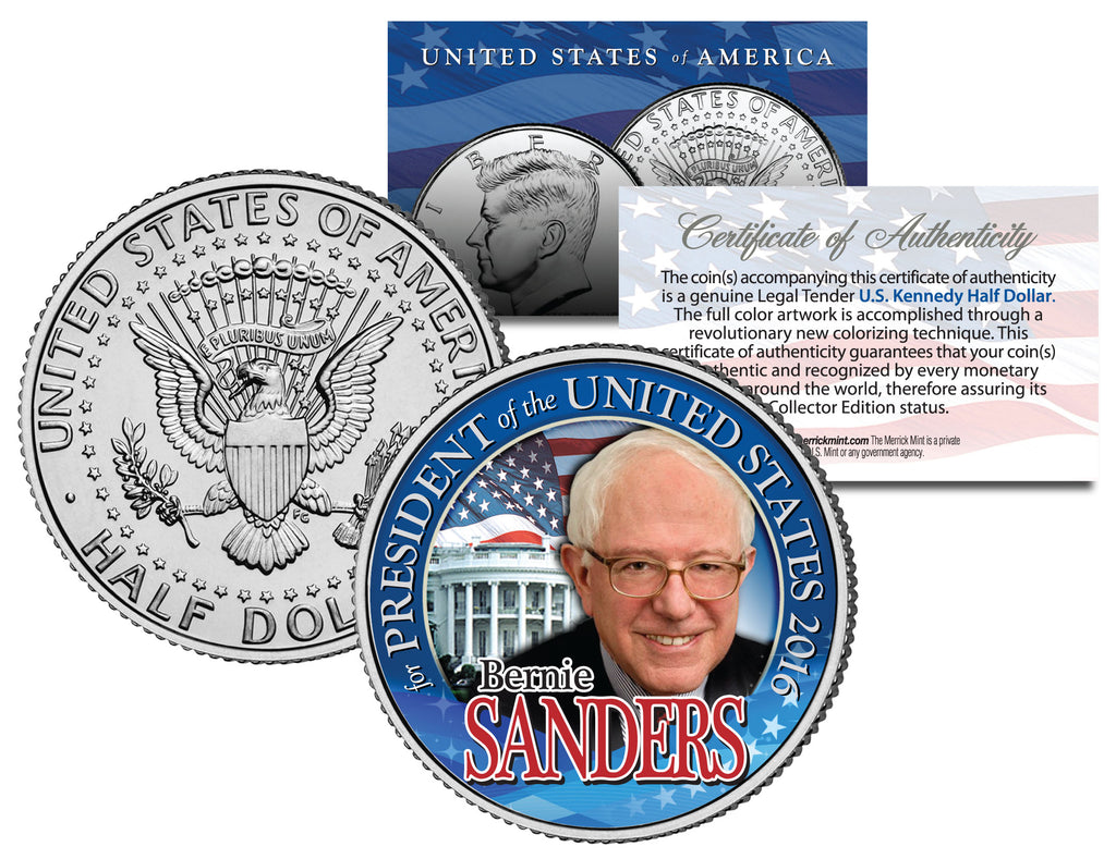 This is the BERNIE SANDERS FOR PRESIDENT OF THE UNITED STATES 2016 collectible coin. Here is your chance to own a beautifully colorized JFK Kennedy Half Dollar U.S. Coin. This high-quality genuine Legal Tender U.S. coin has been colorized using a unique painstaking multicolor authentic process by the Merrick Mint. Colorizing coins involves the unique application of special inks directly to the surface of a coin that achieves a level of detail, color saturation, and durability that is #1 in the coin industry. The result is an everlasting colorized coin collectible of ultra-high quality. Each coin comes in a premium coin capsule with a Certificate of Authenticity to guarantee that your coin is authentic and recognized by every monetary authority around the world, assuring its Collector Edition status.