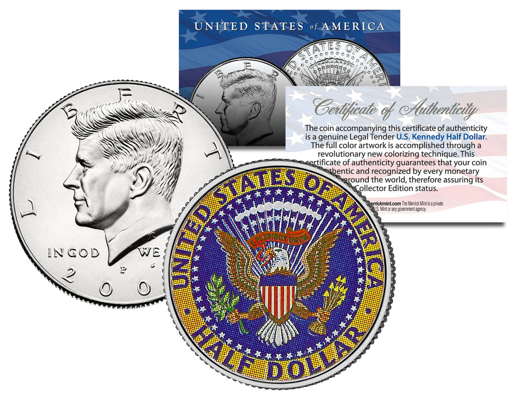 Here is your chance to own a beautifully colorized JFK Kennedy Half Dollar U.S. Coin. Each coin is beautifully enhanced in permanent full-color by the Merrick Mint to highlight the original reverse design using a unique colorizing process, which involves the application of special inks directly to the surface of a coin. The result is an everlasting colorized coin collectible of ultra-high quality that is #1 in the industry. Each coin features the left portrait of John F. Kennedy design on the obverse and a modified presidential seal design on the reverse. Each coin is genuine legal tender of the United States and comes in an acrylic coin holder and includes a Full Color 2-sided Certificate of Authenticity. The Kennedy half dollar is a U.S. fifty cent coin with coin year and mint marks chosen at random.