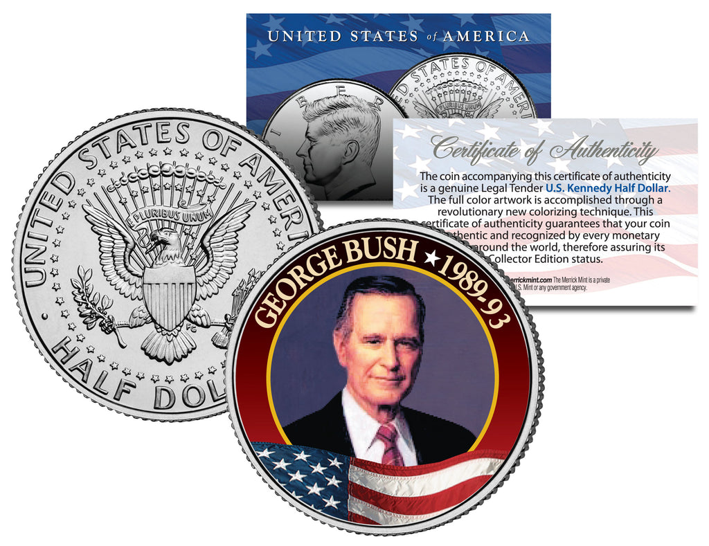 George Herbert Walker Bush was the 41st President of the United States, serving from 1989 to 1993. Here is your opportunity to own or to gift the “GEORGE BUSH – 1989-1993” colorized JFK Kennedy Half Dollar U.S. Coin, which has been enhanced with a beautifully colorized image by the Merrick Mint. Each coin comes in a premium coin capsule with a full color Certificate of Authenticity to guarantee that your coin is authentic and recognized by every monetary authority around the world, assuring its Collector Edition status. This Legal Tender United States coin has been colorized with an application of special inks directly to the surface of the coin, using a unique and painstakingly multicolor coin process, which achieves a level of detail, color saturation, and durability that is #1 in the coin industry. The result is an everlasting colorized coin collectible of ultra-high quality. The Kennedy half dollar is a U.S. fifty cent coin with coin year and mint marks chosen at random.