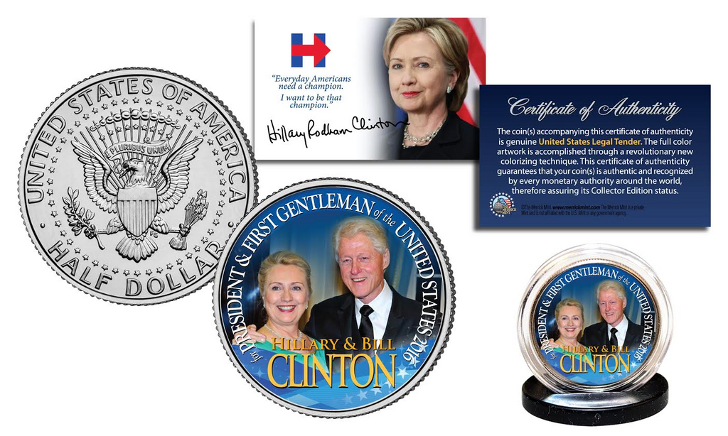 This is the HILLARY & BILL CLINTON FOR PRESIDENT & FIRST GENTLEMAN OF THE UNITED STATES 2016 collectible coin. Here is your chance to own a beautifully colorized JFK Kennedy Half Dollar U.S. Coin. This high-quality genuine Legal Tender U.S. coin has been colorized using a unique painstaking multicolor authentic process by the Merrick Mint. Colorizing coins involves the unique application of special inks directly to the surface of a coin that achieves a level of detail, color saturation, and durability that is #1 in the coin industry. The result is an everlasting colorized coin collectible of ultra-high quality. Each coin comes in a premium coin capsule with a Certificate of Authenticity to guarantee that your coin is authentic and recognized by every monetary authority around the world, assuring its Collector Edition status.
