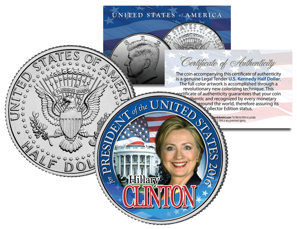 This is the HILLARY CLINTON FOR PRESIDENT OF THE UNITED STATES 2016 collectible coin. Here is your chance to own a beautifully colorized JFK Kennedy Half Dollar U.S. Coin. This high-quality genuine Legal Tender U.S. coin has been colorized using a unique painstaking multicolor authentic process by the Merrick Mint. Colorizing coins involves the unique application of special inks directly to the surface of a coin that achieves a level of detail, color saturation, and durability that is #1 in the coin industry. The result is an everlasting colorized coin collectible of ultra-high quality. Each coin comes in a premium coin capsule with a Certificate of Authenticity to guaranty that your coin is authentic and recognized by every monetary authority around the world, assuring its Collector Edition status. The Kennedy half dollar is a U.S. fifty cent coin with coin year and mint marks chosen at random.