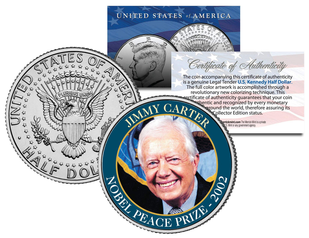 Here is your opportunity to own a beautifully colorized JFK Kennedy Half Dollar U.S. Coin featuring “JIMMY CARTER” in the “NOBEL PEACE PRIZE” coin series. Each coin comes in a premium coin capsule with a full color Certificate of Authenticity to guarantee that your coin is authentic and recognized by every monetary authority around the world, assuring its Collector Edition status. This Legal Tender United States coin has been colorized with an application of special inks directly to the surface of the coin, using a unique and painstakingly multicolor coin process, which achieves a level of detail, color saturation, and durability that is #1 in the coin industry. The result is an everlasting colorized coin collectible of ultra-high quality. The Kennedy half dollar is a U.S. fifty cent coin with coin year and mint marks chosen at random.