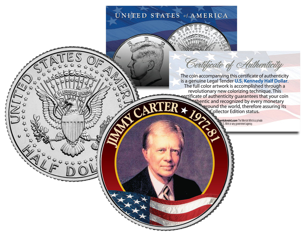 James Earl "Jimmy" Carter, Jr. was the 39th President of the United States, serving from 1977 to 1981. Here is your opportunity to own or to gift the “JIMMY CARTER – 1977-1981” colorized JFK Kennedy Half Dollar U.S. Coin, which has been enhanced with a beautifully colorized image by the Merrick Mint. Each coin comes in a premium coin capsule with a full color Certificate of Authenticity to guarantee that your coin is authentic and recognized by every monetary authority around the world, assuring its Collector Edition status. This Legal Tender United States coin has been colorized with an application of special inks directly to the surface of the coin, using a unique and painstakingly multicolor coin process, which achieves a level of detail, color saturation, and durability that is #1 in the coin industry. The result is an everlasting colorized coin collectible of ultra-high quality. The Kennedy half dollar is a U.S. fifty cent coin with coin year and mint marks chosen at random.