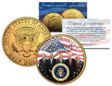 This LIVING PRESIDENTS – AMERICANA coin is a treasured collectible. Here is your chance to own a LIVING PRESIDENTS beautifully colorized LEGAL TENDER 24KT Gold Plated JFK Kennedy Half Dollar U.S. Coin. This high-quality U.S. coin has been layered in Genuine 24 Karat Gold, and then enhanced with beautiful colorized images using a unique painstaking multicolor authentic process. Colorizing coins involves the unique application of special inks directly to the surface of a coin that achieves a level of detail, color saturation, and durability that is #1 in the coin industry. The result is an everlasting colorized coin collectible of ultra-high quality. Each coin comes in a premium coin capsule with a Certificate of Authenticity to guarantee that your coin is authentic and recognized by every monetary authority around the world, assuring its Collector Edition status.
