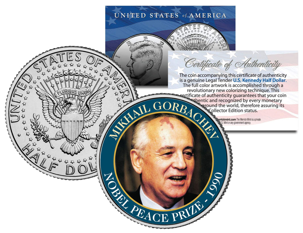 Here is your opportunity to own a beautifully colorized JFK Kennedy Half Dollar U.S. Coin featuring "MIKHAIL GORBACHEV” in the “NOBEL PEACE PRIZE” coin series. Each coin comes in a premium coin capsule with a full color Certificate of Authenticity to guarantee that your coin is authentic and recognized by every monetary authority around the world, assuring its Collector Edition status. This Legal Tender United States coin has been colorized with an application of special inks directly to the surface of the coin, using a unique and painstakingly multicolor coin process, which achieves a level of detail, color saturation, and durability that is #1 in the coin industry. The result is an everlasting colorized coin collectible of ultra-high quality. The Kennedy half dollar is a U.S. fifty cent coin with coin year and mint marks chosen at random.