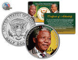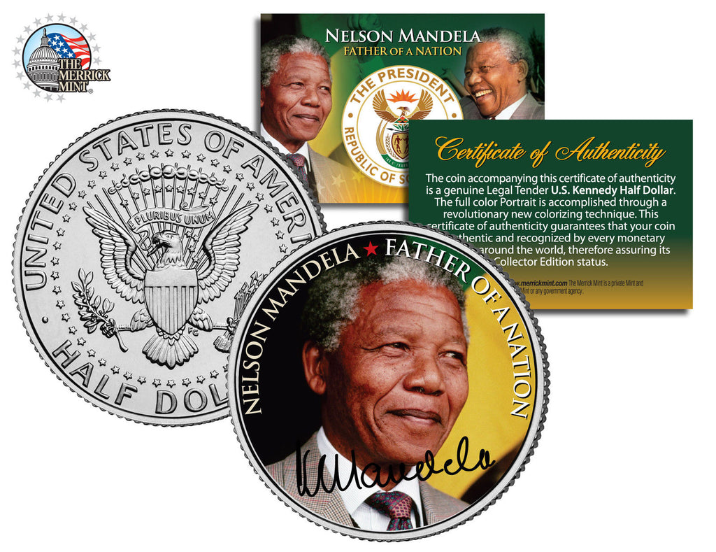 Nelson Mandela became the first black president of South Africa in 1994. A symbol of global peacemaking, he won the Nobel Peace Prize in 1993. Across the world, Mandela came to be seen as "a moral authority" with a great concern for truth. Nelson Mandela is the greatest leader of our time! Authentic Colorization Process by the Merrick Mint. The #1 leaders in coin colorization. Brilliant Uncirculated Condition. Genuine legal tender. U.S. Kennedy Half Dollar. Comes in air-tight acrylic coin holder. VERY LIMITED EDITION....ORDER NOW!!! CERTIFICATE OF AUTHENTICITY INCLUDED
