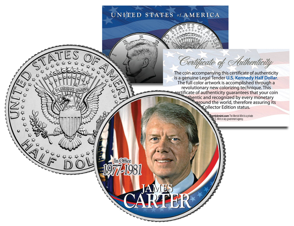 James Earl "Jimmy" Carter, Jr. was the 39th President of the United States, serving from 1977 to 1981. Here is your opportunity to own or to gift the “JAMES CARTER – IN OFFICE 1977-1981” colorized JFK Kennedy Half Dollar U.S. Coin, which has been enhanced with a beautifully colorized image by the Merrick Mint. Each coin comes in a premium coin capsule with a full color Certificate of Authenticity to guarantee that your coin is authentic and recognized by every monetary authority around the world, assuring its Collector Edition status. This Legal Tender United States coin has been colorized with an application of special inks directly to the surface of the coin, using a unique and painstakingly multicolor coin process, which achieves a level of detail, color saturation, and durability that is #1 in the coin industry. The result is an everlasting colorized coin collectible of ultra-high quality. The Kennedy half dollar is a U.S. fifty cent coin with coin year and mint marks chosen at random.