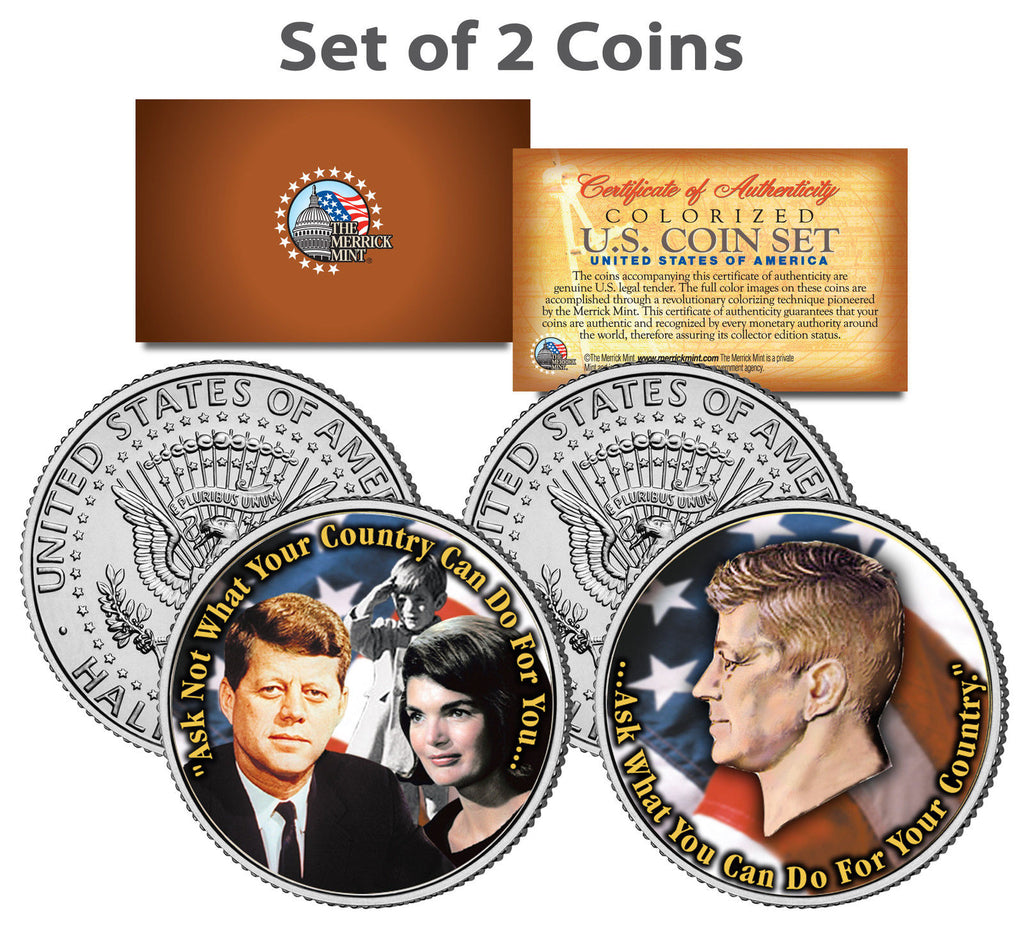 In this special set you get the following 2 coins with President John F. Kennedy's famous quote from his Inauguration Speech: "Ask not what your country can do for you, ask what you can do for your country." Here is your chance to own an OFFICIAL beautifully colorized JFK Kennedy Half Dollar U.S. Coin. This official high-quality genuine Legal Tender United States Coin has been colorized using a unique multicolor authentic process. Colorizing coins involves the unique application of special inks directly to the surface of a coin using a unique and painstakingly multicolor coin process that achieves a level of detail, color saturation, and durability that is #1 in the industry. The result is an everlasting colorized coin collectible of ultra-high quality. Each coin comes in a premium coin capsule with a Certificate of Authenticity.