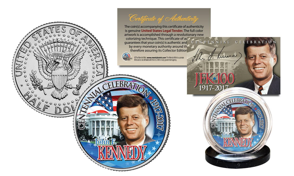 This is the President JOHN F. KENNEDY JFK100 Centennial Celebration collectible coin. Here is your chance to own a beautifully colorized JFK Kennedy Half Dollar U.S. Coin. This high-quality genuine Legal Tender U.S. coin has been colorized using a unique painstaking multicolor authentic process by the Merrick Mint. Colorizing coins involves the unique application of special inks directly to the surface of a coin that achieves a level of detail, color saturation, and durability that is #1 in the coin industry. The result is an everlasting colorized coin collectible of ultra-high quality. Each coin comes in a premium coin capsule with a Certificate of Authenticity to guarantee that your coin is authentic and recognized by every monetary authority around the world, assuring its Collector Edition status. About JFK100 - The entire United States has announced a year-long celebration to honor the 100th anniversary of the birth of President John F. Kennedy. Born in Brookline, Massachusetts on May 29, 1917, President Kennedy was the youngest president ever elected to office. To commemorate his centennial year, the United States is spearheading a series of events and initiatives aimed at inspiring new generations to find meaning and inspiration in the enduring values that formed the heart of the Kennedy presidency.