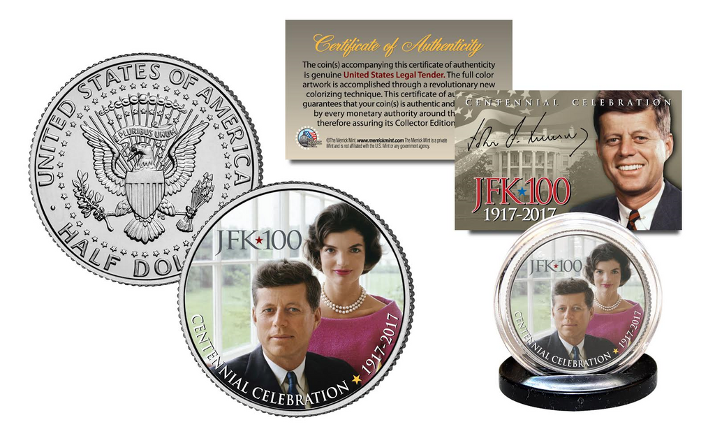 This is the President JOHN F. KENNEDY JFK100 Centennial Celebration collectible coin. Here is your chance to own a beautifully colorized JFK Kennedy Half Dollar U.S. Coin. This high-quality genuine Legal Tender U.S. coin has been colorized using a unique painstaking multicolor authentic process by the Merrick Mint. Colorizing coins involves the unique application of special inks directly to the surface of a coin that achieves a level of detail, color saturation, and durability that is #1 in the coin industry. The result is an everlasting colorized coin collectible of ultra-high quality. Each coin comes in a premium coin capsule with a Certificate of Authenticity to guarantee that your coin is authentic and recognized by every monetary authority around the world, assuring its Collector Edition status.
