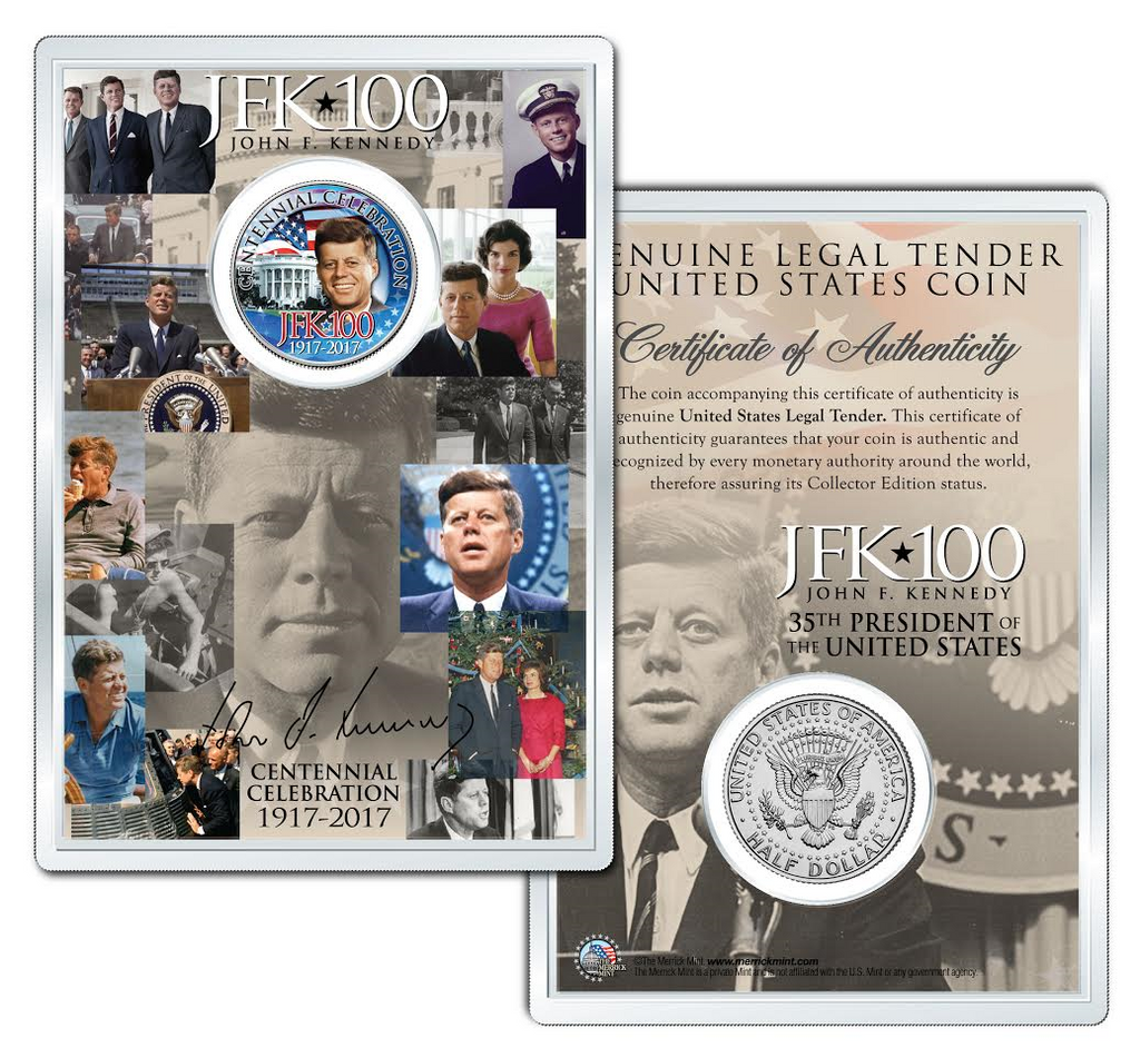 Here is your chance to own a beautifully colorized JFK Kennedy Half Dollar U.S. Coin. This high-quality genuine Legal Tender U.S. coin has been colorized using a unique painstaking multicolor authentic process by the Merrick Mint. Colorizing coins involves the unique application of special inks directly to the surface of a coin that achieves a level of detail, color saturation, and durability that is #1 in the coin industry. The result is an everlasting colorized coin collectible of ultra-high quality. Each coin comes in a premium coin capsule with a Certificate of Authenticity to guaranty that your coin is authentic and recognized by every monetary authority around the world, assuring its Collector Edition status. Each coin comes displayed on a die-cut display with beautiful artwork sealed in a 4” x 6” acrylic airtight case.