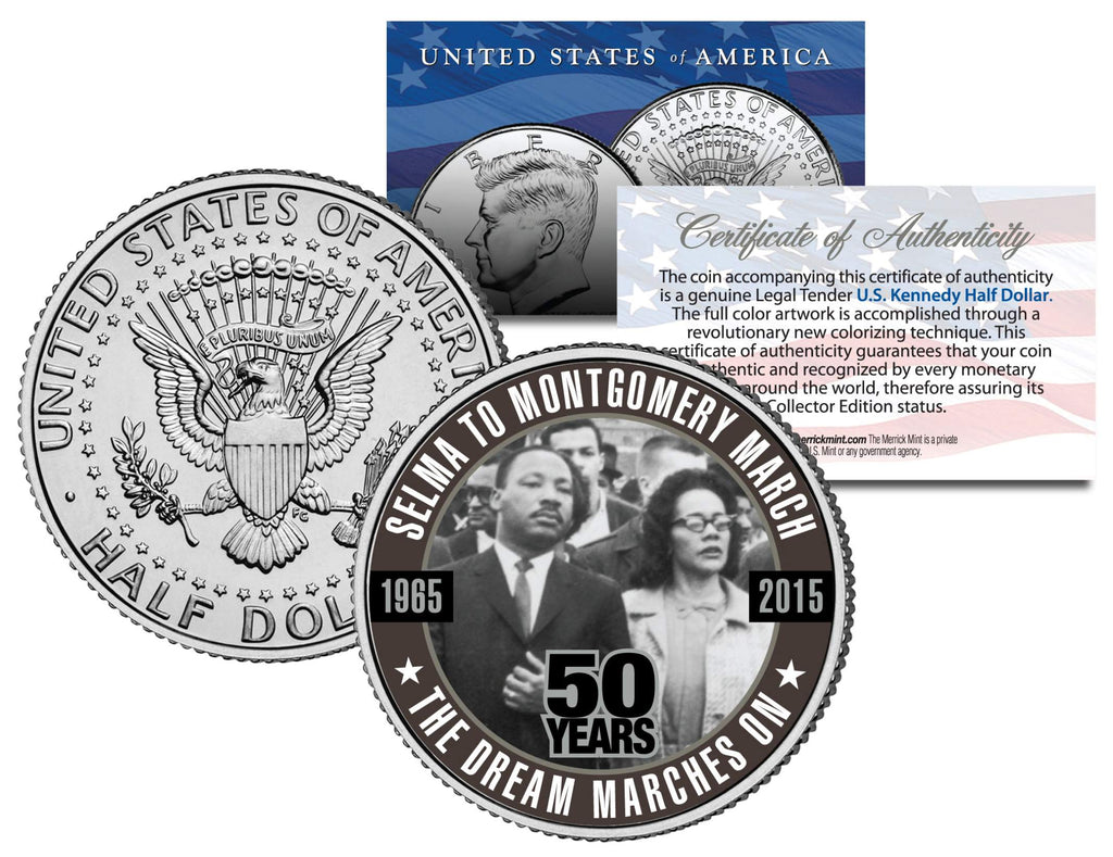 Here is your opportunity to own or gift the SELMA TO MONTGOMERY MARCH – 50 YEARS – THE DREAM MARCHES ON colorized 2015 JFK Kennedy Half Dollar U.S. Coin, which has been enhanced with a colorized image by the Merrick Mint. Each coin comes in a premium coin capsule with a full color Certificate of Authenticity to guarantee that your coin is authentic and recognized by every monetary authority around the world. This Legal Tender United States coin has been colorized with an application of special inks directly to the surface of the coin, using a unique and painstakingly multicolor coin process, which achieves a level of detail, color saturation, and durability that is #1 in the coin industry. The result is an everlasting colorized coin collectible of ultra-high quality.
