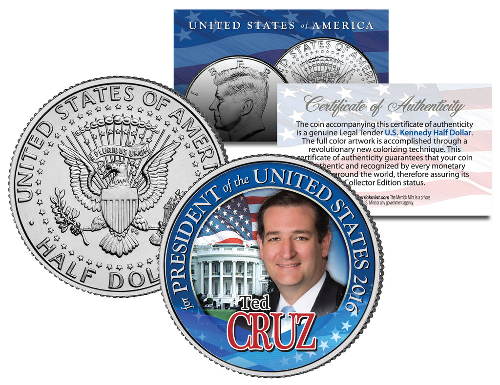 This is the TED CRUZ FOR PRESIDENT OF THE UNITED STATES 2016 collectible coin. Here is your chance to own a beautifully colorized JFK Kennedy Half Dollar U.S. Coin. This high-quality genuine Legal Tender U.S. coin has been colorized using a unique painstaking multicolor authentic process by the Merrick Mint. Colorizing coins involves the unique application of special inks directly to the surface of a coin that achieves a level of detail, color saturation, and durability that is #1 in the coin industry. The result is an everlasting colorized coin collectible of ultra-high quality. Each coin comes in a premium coin capsule with a Certificate of Authenticity to guarantee that your coin is authentic and recognized by every monetary authority around the world, assuring its Collector Edition status.