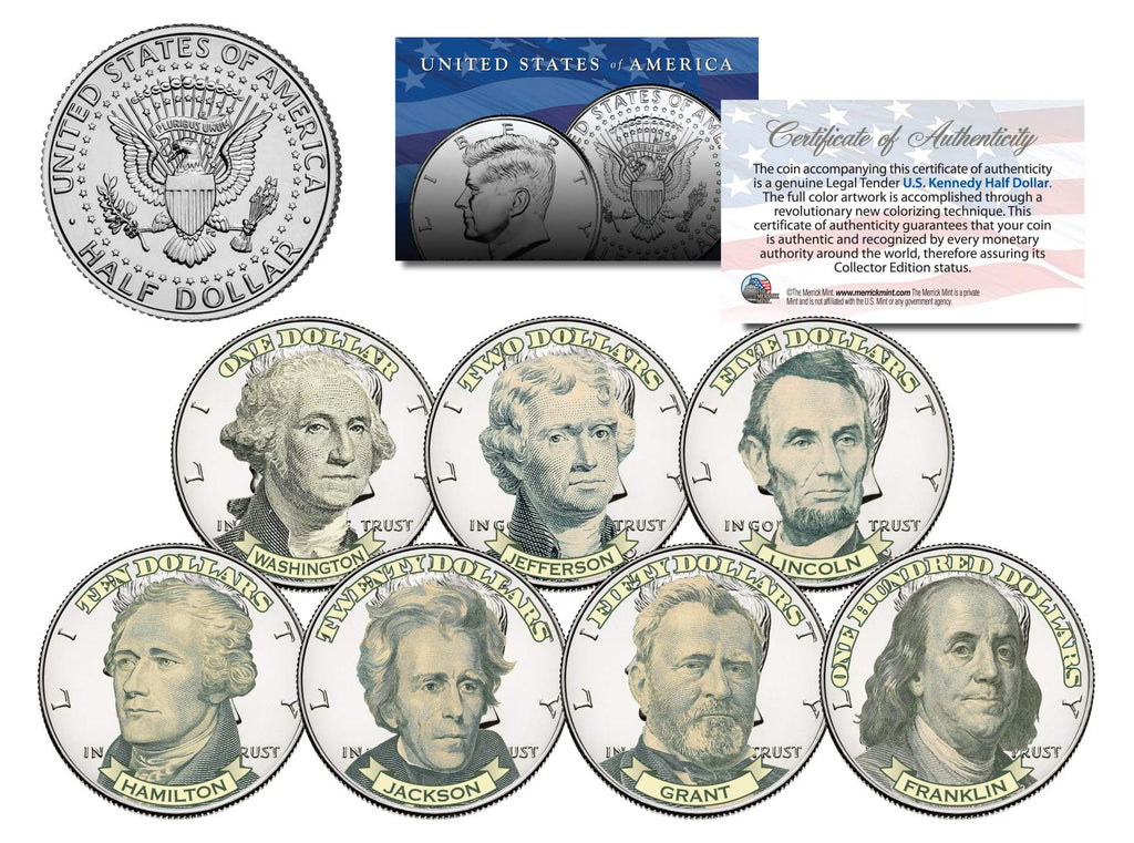 This exclusive U.S. BANKNOTES PORTRAIT DESIGN complete 7-coin set is a treasured collectible, combining for the first time the designs of all seven (7) denominations of U.S. paper money with coin collecting. Here is your chance to own beautifully colorized JFK Kennedy Half Dollar U.S. Coins. These high-quality genuine Legal Tender U.S. coins have been colorized by the Merrick Mint, a private mint, using a unique painstaking multicolor authentic process. Colorizing coins involves the unique application of special inks directly to the surface of a coin that achieves a level of detail, color saturation, and durability that is #1 in the coin industry. The result is an everlasting colorized coin collectible of ultra-high quality. Each coin comes in a premium coin capsule. The set comes with a Certificate of Authenticity to guarantee that your coins are authentic and recognized by every monetary authority around the world, assuring its Collector Edition status.