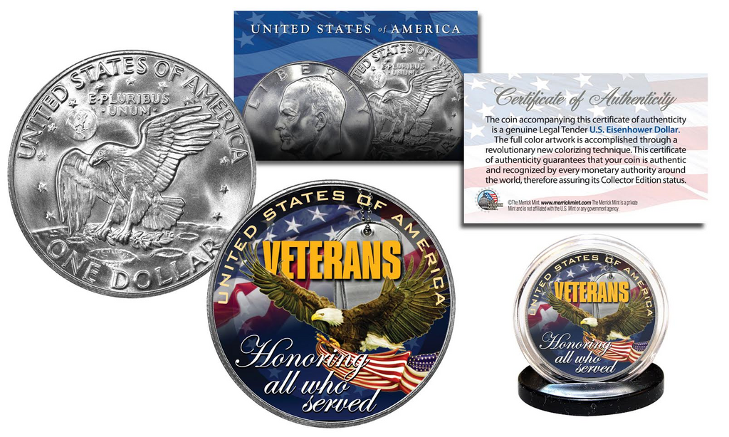This is the VETERANS collectible coin. Here is your chance to own a beautifully colorized IKE Eisenhower One Dollar U.S. Coin. This high-quality genuine Legal Tender U.S. coin has been colorized using a unique painstaking multicolor authentic process by the Merrick Mint. Colorizing coins involves the unique application of special inks directly to the surface of a coin that achieves a level of detail, color saturation, and durability that is #1 in the coin industry. The result is an everlasting colorized coin collectible of ultra-high quality. Each coin comes in a premium coin capsule with a Certificate of Authenticity to guarantee that your coin is authentic and recognized by every monetary authority around the world, assuring its Collector Edition status.