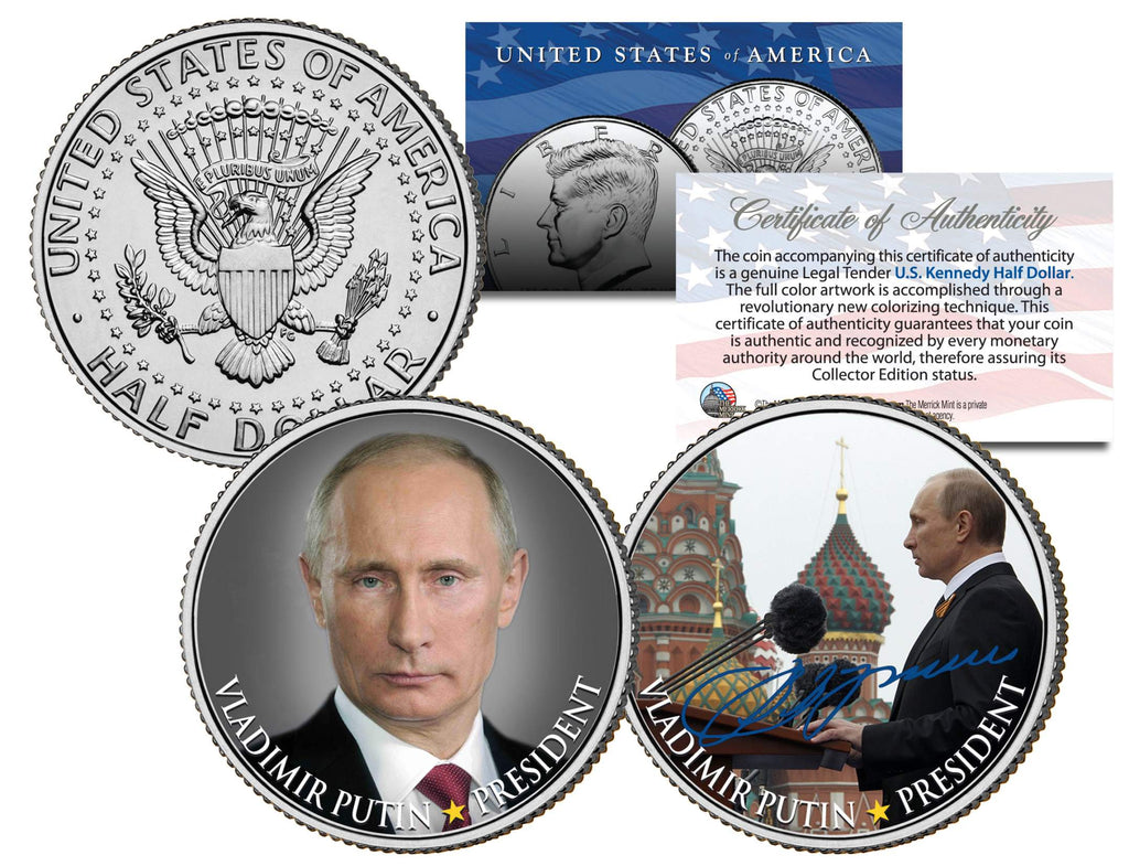 This VLADIMIR PUTIN 2-coin set is a treasured collectible, combining the popularity of the Russian President with coin collecting. Here is your chance to own beautifully colorized JFK Kennedy Half Dollar U.S. Coins. These high-quality genuine Legal Tender U.S. coins have been colorized using a unique painstaking multicolor authentic process. Colorizing coins involves the unique application of special inks directly to the surface of a coin that achieves a level of detail, color saturation, and durability that is #1 in the coin industry. The result is an everlasting colorized coin collectible of ultra-high quality. Each coin comes in a premium coin capsule. The set comes with a Certificate of Authenticity to guarantee that your coins are authentic and recognized by every monetary authority around the world, assuring its Collector Edition status.